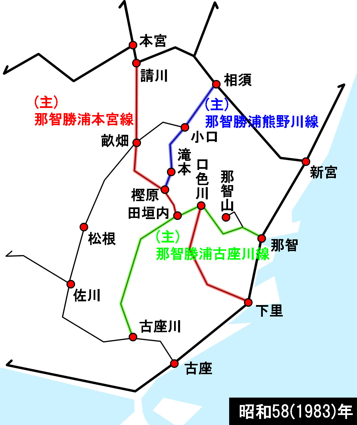 さらに12年後の昭和51年には、主要地方道那智勝浦相須線や一般県道口色川下里停車場線などが追加指定され(チェンジ後の画像)、一帯の県道路線網は現在のものにより近づいてくる。