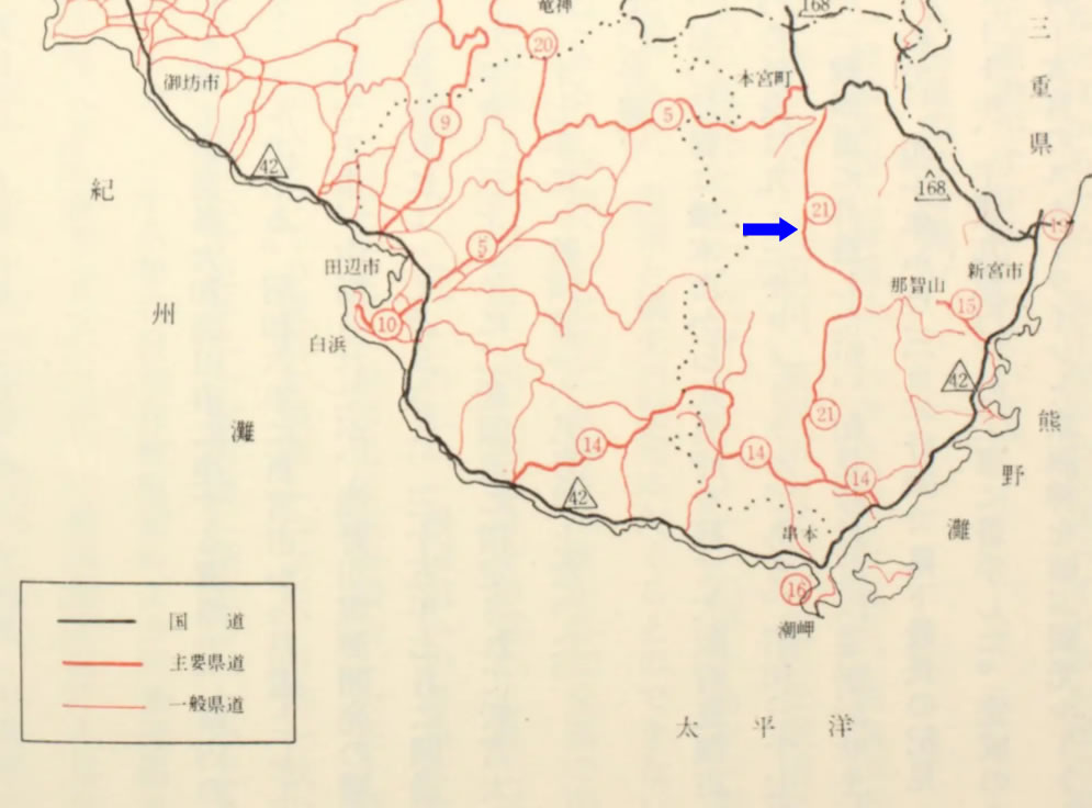 上図は、『和歌山県政史 第3巻』に掲載された昭和40(1965)年4月現在の「和歌山道路図」の一部であるが、青矢印の位置を南北に貫く太い赤い線が、和歌山県道21号として認定されていた当時の主要地方道本宮古座川線である。青矢印を置いた位置がだいたい畝畑の辺りだ。