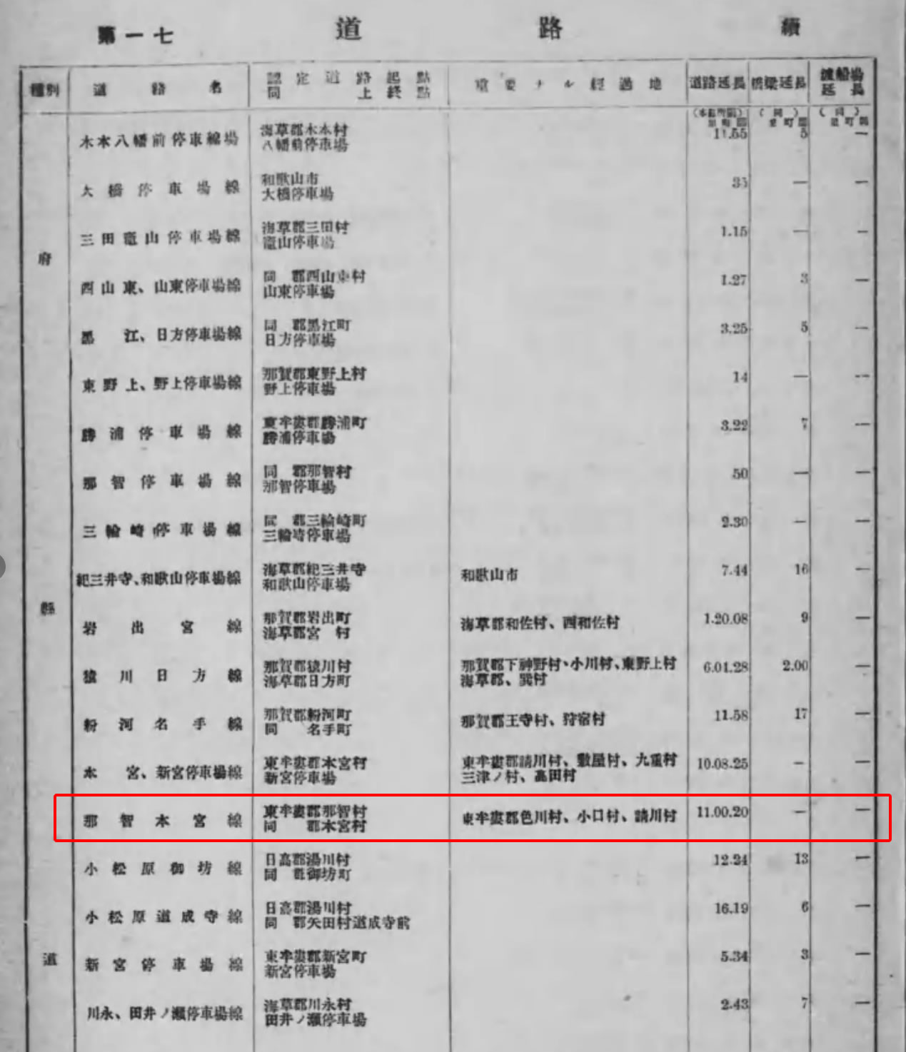 | 種別 | 道路名 | 起点/終点 | 重要ナル経由地 | 道路延長 | 橋梁延長 | 渡船場延長 |
