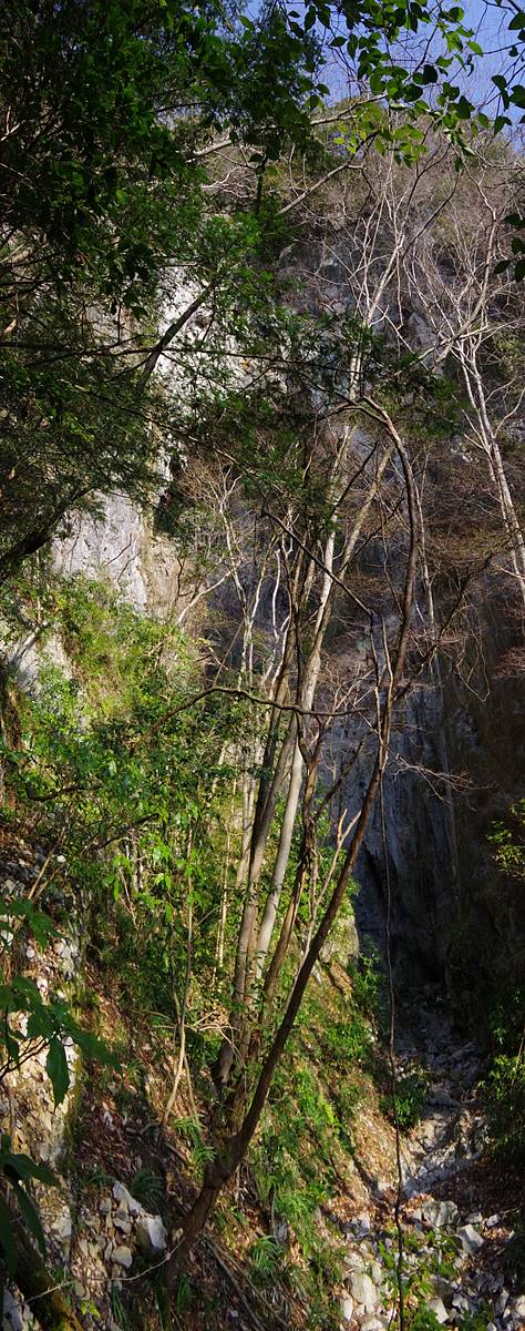 鬼女洞の巨大な坑口を包含する、白亜の大岩壁を振り返っている。