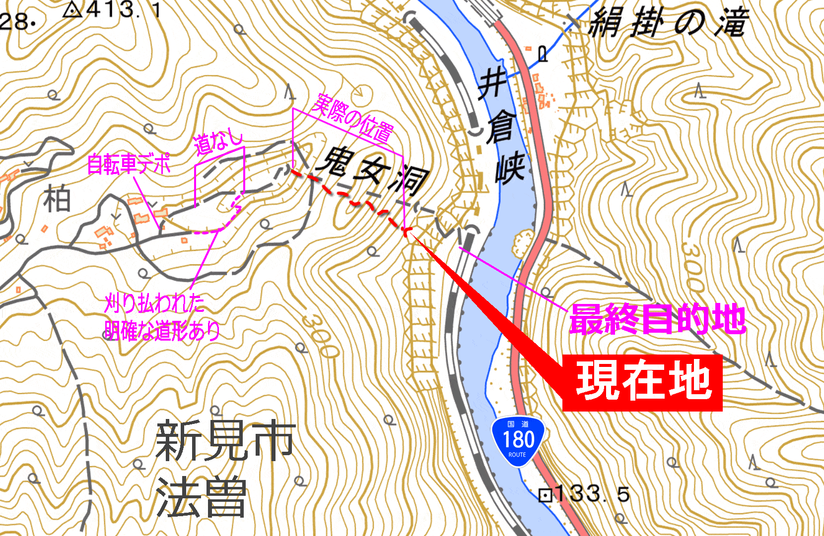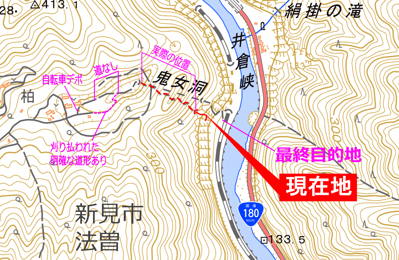 GPSの画面で見る「現在地」は、すっかり地形図の崖の記号に重なってしまっていて、等高線による地形表現を放棄していた。