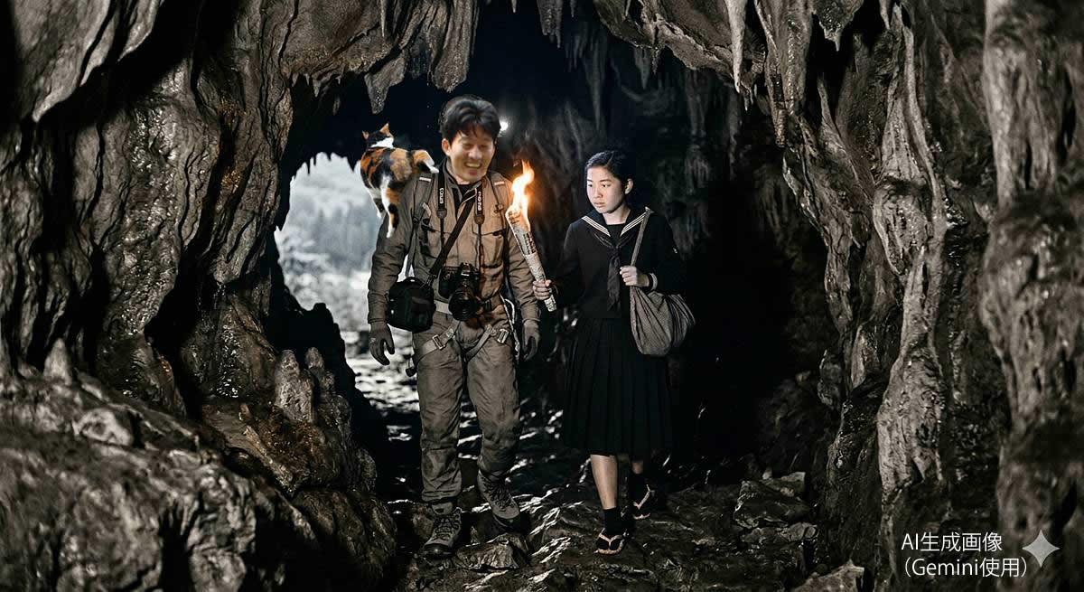 その際には、イメージ画像のように、丸めた新聞紙に火を付けたものを灯りとして、それが燃え尽きるまでに脱兎の如く洞内を駆け下ったという。