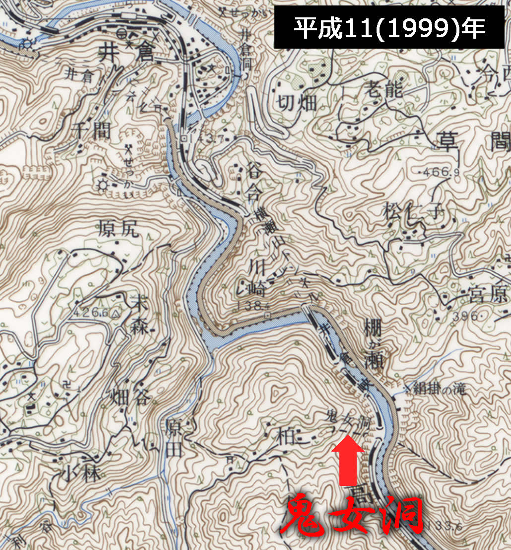 @平成11(1999)年版には、はっきりと鬼女洞が描かれている。しかも、最新の地理院地図と同じで、貫通した道路トンネル同然の表現をされている。