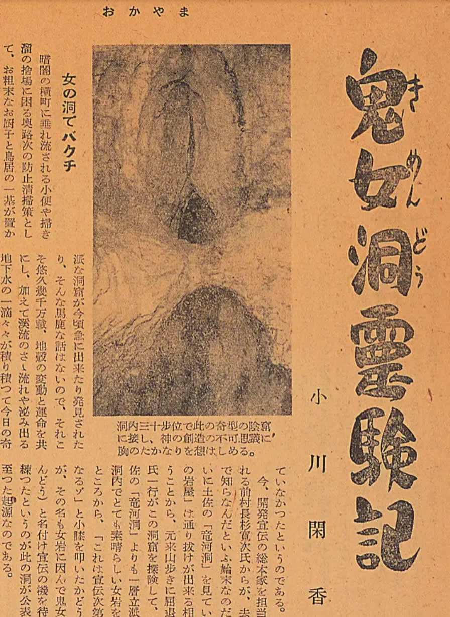 この記事、穏当な掲載誌名に似合わず、随分と“わい”方面に尖っていて、それは記事のトップ写真チョイスや、そのキャプション(洞内三十歩で此の奇型の陰窟に接し、神の創造の不可思議に胸のたかなりを想わしめる